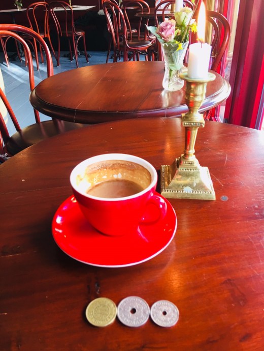 Just yesterday I had a beautiful Coffee Coa in Denmark. A shot of espresso and a piece of chocolate melted into it. Hygge in a cup. There is no photographic evidence of the actual cup but this one came close. It’s a cappuccino in a red cafe with candles on every table. Lovely and 25 Krone.